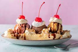 Three large scoops of ice cream ( chocolate , strawberry & vanilla. Banana , hot fudge , strawberry sauce, crushed peanuts , whip cream , and a cherries.