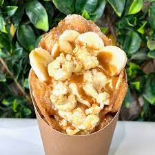Vanilla ice cream , Sliced bananas , caramel sauce , shredded coconut and whip cream.
