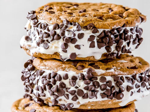 chocolate chips cookies , vanilla ice cream and rolled in mini chocolate chips.