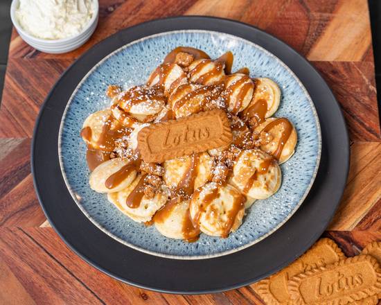 Lotus Sauce , Lotus Biscoff crumble , maple syrup and whip cream.