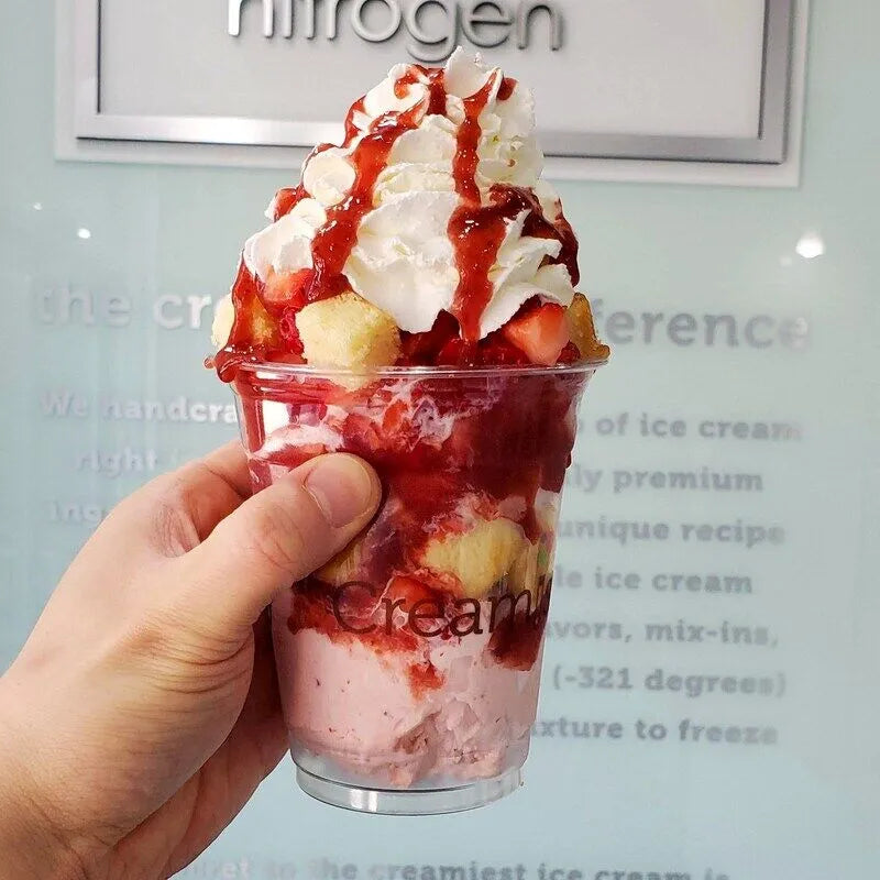Strawberry ice cream , Vanilla cake pieces, cheesecake pieces , strawberry sauce , white chocolate drizzle and whip cream