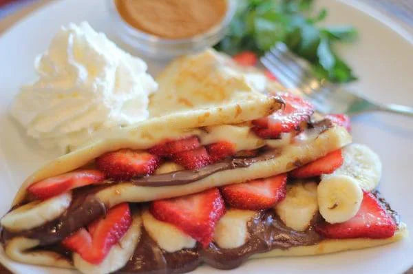 Vanilla ice cream , strawberries , bananas , Nutella and whip cream.